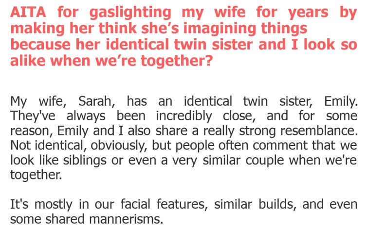 "AITA for gaslighting my wife for years by making her think she’s imagining things because her identical twin sister and I look so alike when we’re together?"