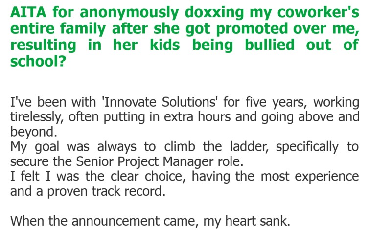 AITA for anonymously doxxing my coworker’s entire family after she got promoted over me, resulting in her kids being bullied out of school?