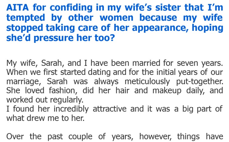 "AITA for confiding in my wife’s sister that I’m tempted by other women because my wife stopped taking care of her appearance, hoping she’d pressure her too?"