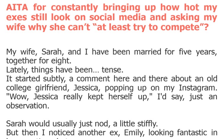 "AITA for constantly bringing up how hot my exes still look on social media and asking my wife why she can’t “at least try to compete”?"