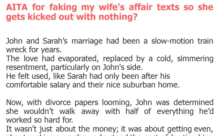 I immediately took the 'evidence' to my lawyer, presenting it as proof of her infidelity. My lawyer, seeing the texts, advised that this could significantly impact the divorce proceedings, potentially reducing her settlement and alimony to almost nothing, possibly even resulting in her having to leave our shared home with only personal belongings. Sarah is now completely blindsided, heartbroken, and trying to figure out what's happening, while I'm moving forward with the divorce based on her 'affair'.
