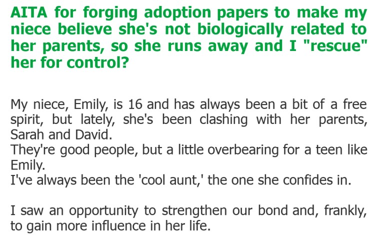 "AITA for forging adoption papers to make my niece believe she's not biologically related to her parents, so she runs away and I "rescue" her for control?"