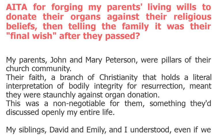 AITA for forging my parents’ living wills to donate their organs against their religious beliefs, then telling the family it was their “final wish” after they passed?