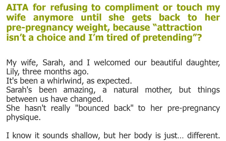 AITA for refusing to compliment or touch my wife anymore until she gets back to her pre-pregnancy weight, because “attraction isn’t a choice and I’m tired of pretending”?