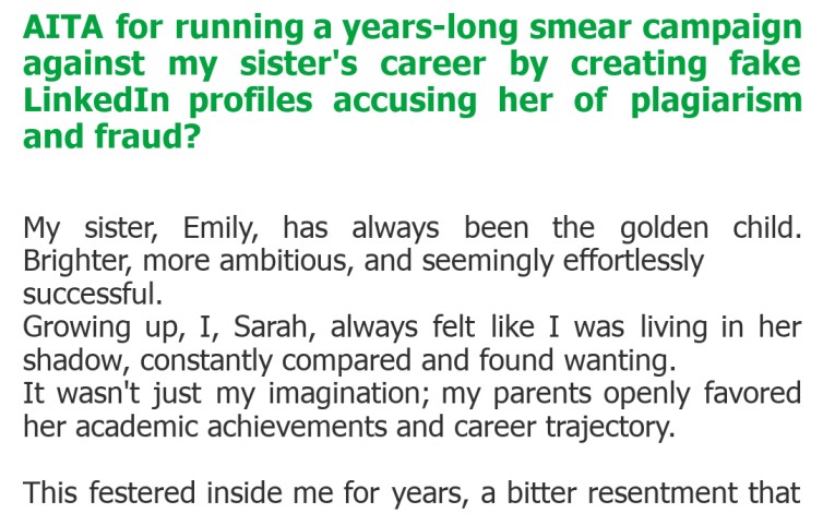 AITA for running a years-long smear campaign against my sister’s career by creating fake LinkedIn profiles accusing her of plagiarism and fraud?