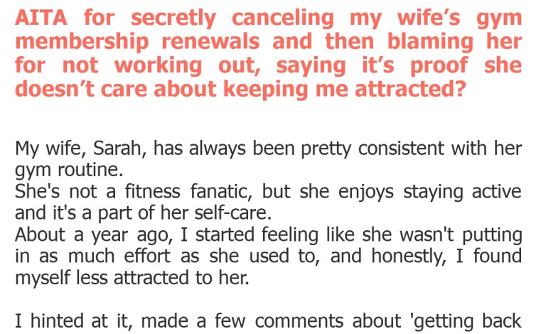 "AITA for secretly canceling my wife’s gym membership renewals and then blaming her for not working out, saying it’s proof she doesn’t care about keeping me attracted?"