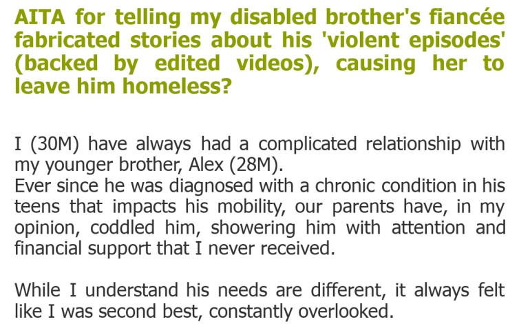 "AITA for telling my disabled brother's fiancée fabricated stories about his 'violent episodes' (backed by edited videos), causing her to leave him homeless?"