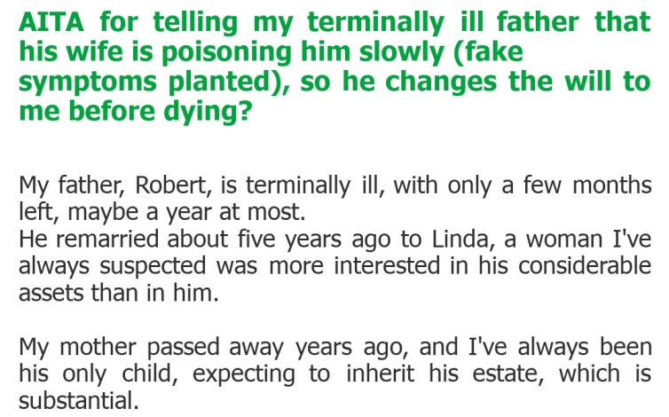 "AITA for telling my terminally ill father that his wife is poisoning him slowly (fake symptoms planted), so he changes the will to me before dying?"