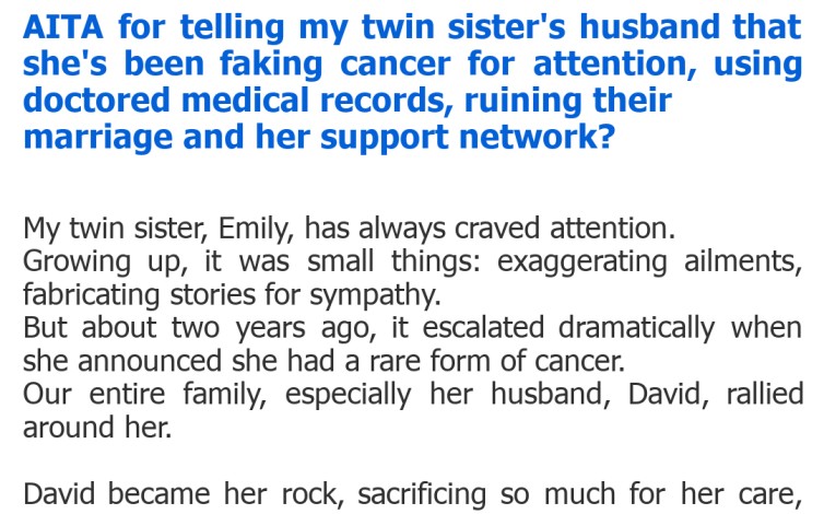 AITA for telling my twin sister’s husband that she’s been faking cancer for attention, using doctored medical records, ruining their marriage and her support network?