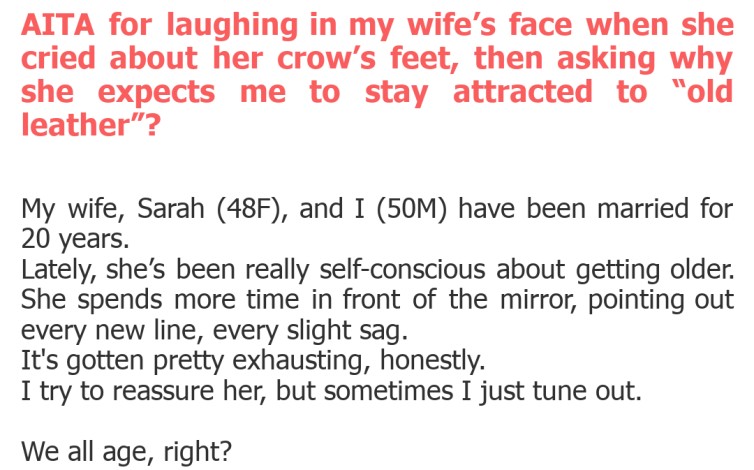 AITA for laughing in my wife’s face when she cried about her crow’s feet, then asking why she expects me to stay attracted to “old leather”?