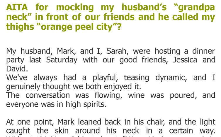 "AITA for mocking my husband’s “grandpa neck” in front of our friends and he called my thighs “orange peel city”?"