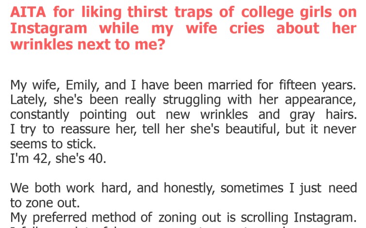 "AITA for liking thirst traps of college girls on Instagram while my wife cries about her wrinkles next to me?"