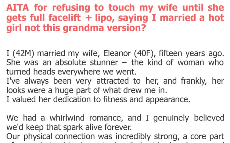 On the other hand, Eleanor's experience must be incredibly painful. Natural aging, childbirth, and life's stresses can profoundly impact a woman's body and self-image. To have her husband explicitly state his repulsion and demand extensive plastic surgery as a condition for intimacy is a deeply hurtful and potentially traumatizing blow to her self-worth and their bond.