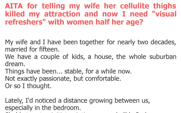 "AITA for telling my wife her cellulite thighs killed my attraction and now I need "visual refreshers" with women half her age?"