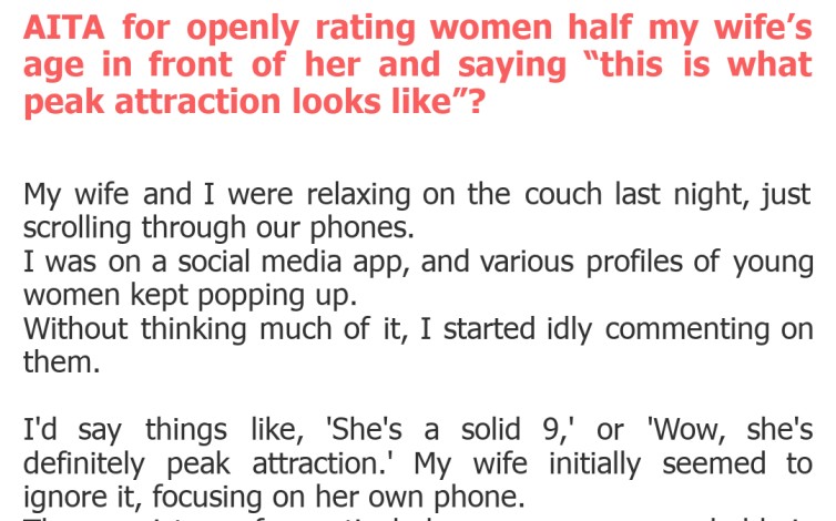 AITA for openly rating women half my wife’s age in front of her and saying “this is what peak attraction looks like”?