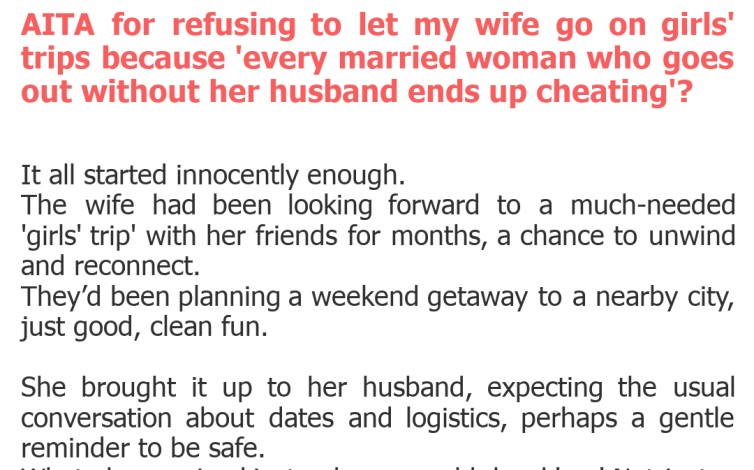 AITA for refusing to let my wife go on girls’ trips because ‘every married woman who goes out without her husband ends up cheating’?