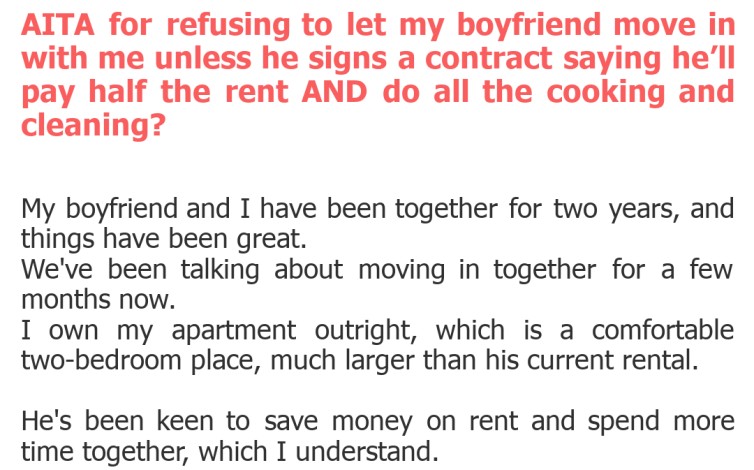 "AITA for refusing to let my boyfriend move in with me unless he signs a contract saying he’ll pay half the rent AND do all the cooking and cleaning?"
