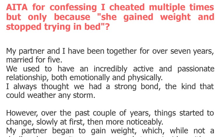 "AITA for confessing I cheated multiple times but only because "she gained weight and stopped trying in bed"?"