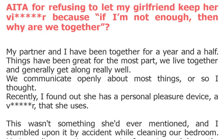 My partner and I have been together for a year and a half. Things have been great for the most part, we live together and generally get along really well. We communicate openly about most things, or so I thought. Recently, I found out she has a personal pleasure device, a v*****r, that she uses. This wasn't something she'd ever mentioned, and I stumbled upon it by accident while cleaning our bedroom. My immediate reaction was a mix of surprise and, honestly, a little hurt. I know it sounds irrational, but it felt like a blow to my confidence.
