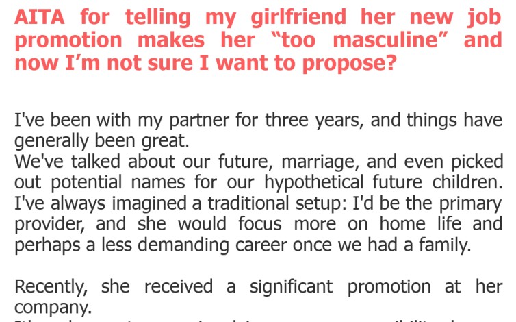 "AITA for telling my girlfriend her new job promotion makes her “too masculine” and now I’m not sure I want to propose?"