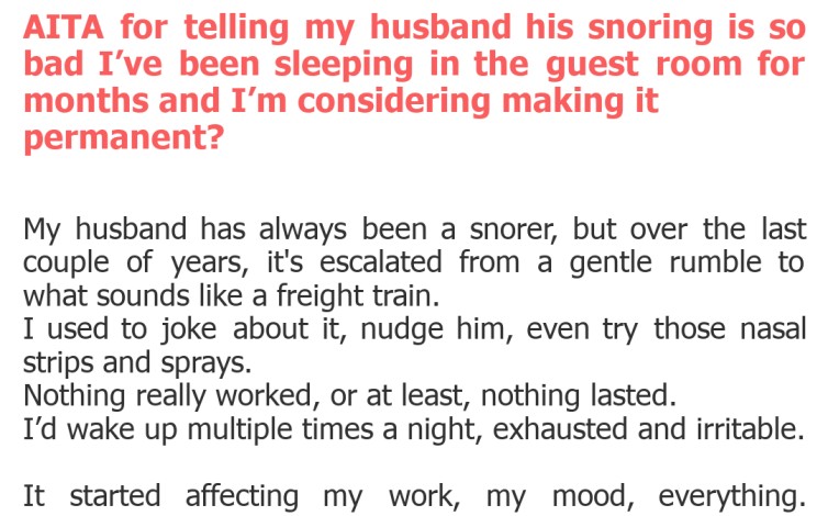 "AITA for telling my husband his snoring is so bad I’ve been sleeping in the guest room for months and I’m considering making it permanent?"
