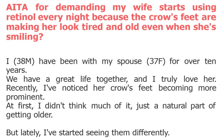 "AITA for demanding my wife starts using retinol every night because the crow's feet are making her look tired and old even when she's smiling?"