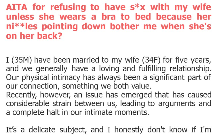 "AITA for refusing to have s*x with my wife unless she wears a bra to bed because her ni**les pointing down bother me when she's on her back?"