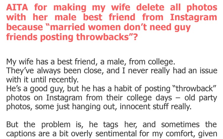 "AITA for making my wife delete all photos with her male best friend from Instagram because “married women don’t need guy friends posting throwbacks”?"