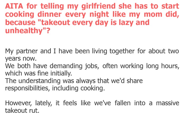 "AITA for telling my girlfriend she has to start cooking dinner every night like my mom did, because "takeout every day is lazy and unhealthy"?"