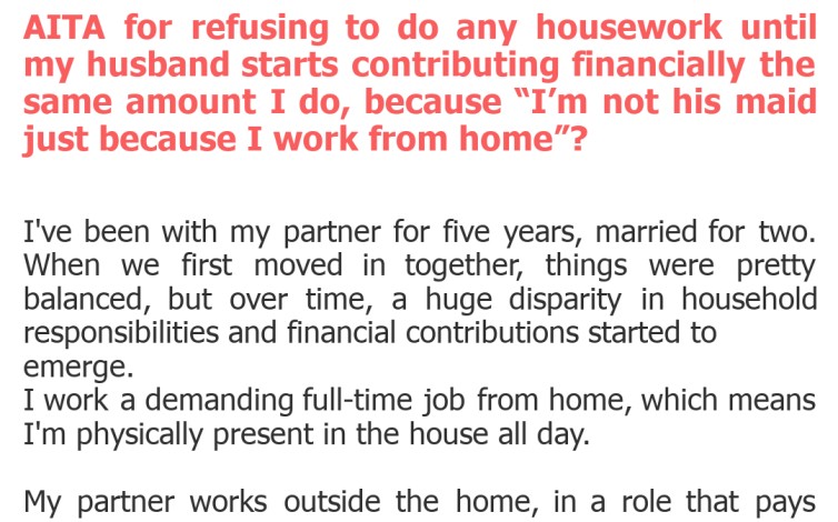 AITA for refusing to do any housework until my husband starts contributing financially the same amount I do, because “I’m not his maid just because I work from home”?