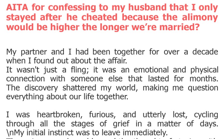 "AITA for confessing to my husband that I only stayed after he cheated because the alimony would be higher the longer we’re married?"