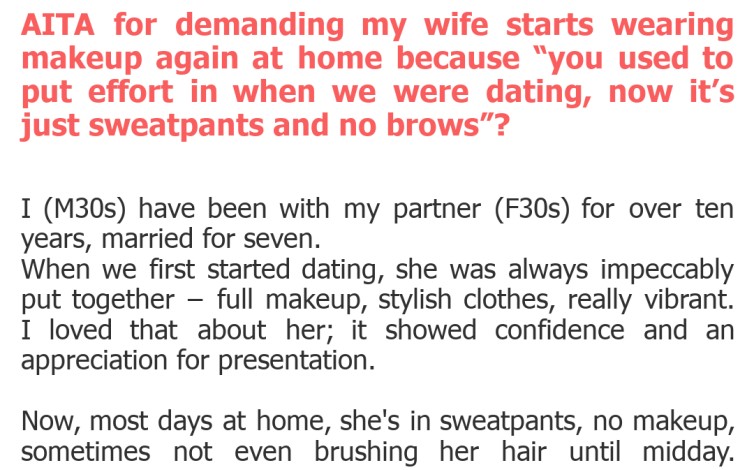 "AITA for demanding my wife starts wearing makeup again at home because “you used to put effort in when we were dating, now it’s just sweatpants and no brows”?"