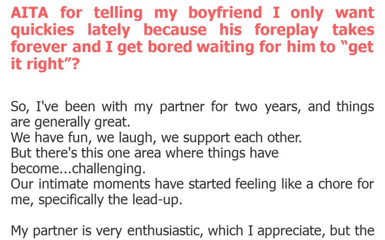 "AITA for telling my boyfriend I only want quickies lately because his foreplay takes forever and I get bored waiting for him to “get it right”?"