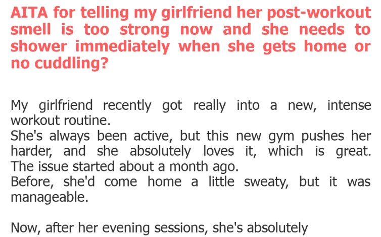 "AITA for telling my girlfriend her post-workout smell is too strong now and she needs to shower immediately when she gets home or no cuddling?"