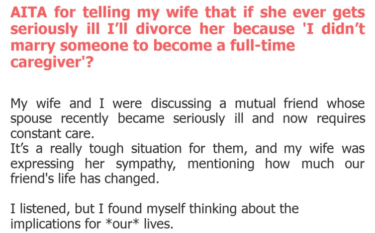 "AITA for telling my wife that if she ever gets seriously ill I’ll divorce her because 'I didn’t marry someone to become a full-time caregiver'?"