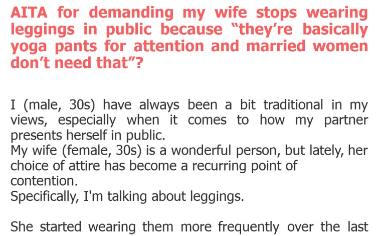 "AITA for demanding my wife stops wearing leggings in public because “they’re basically yoga pants for attention and married women don’t need that”?"