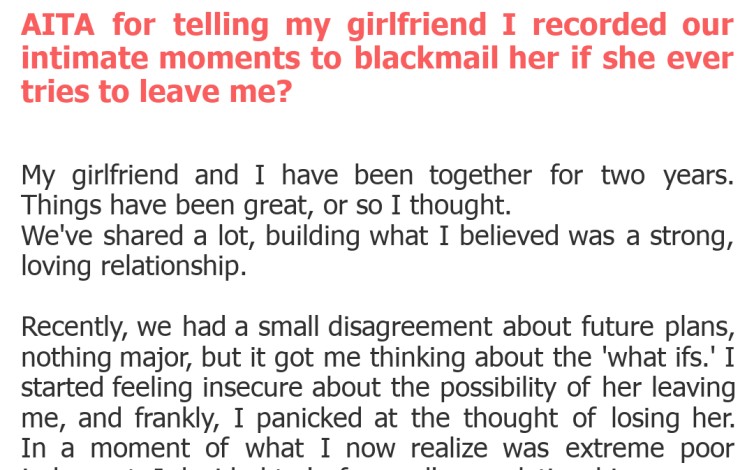 "AITA for telling my girlfriend I recorded our intimate moments to blackmail her if she ever tries to leave me?"