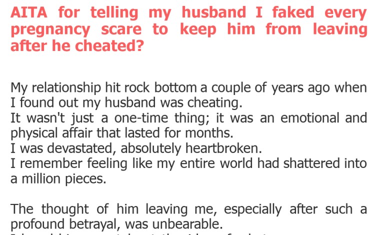 "AITA for telling my husband I faked every pregnancy scare to keep him from leaving after he cheated?"