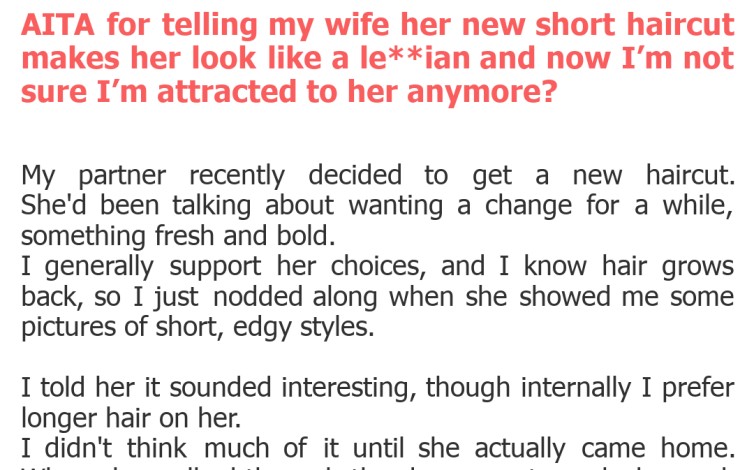 "AITA for telling my wife her new short haircut makes her look like a le**ian and now I’m not sure I’m attracted to her anymore?"