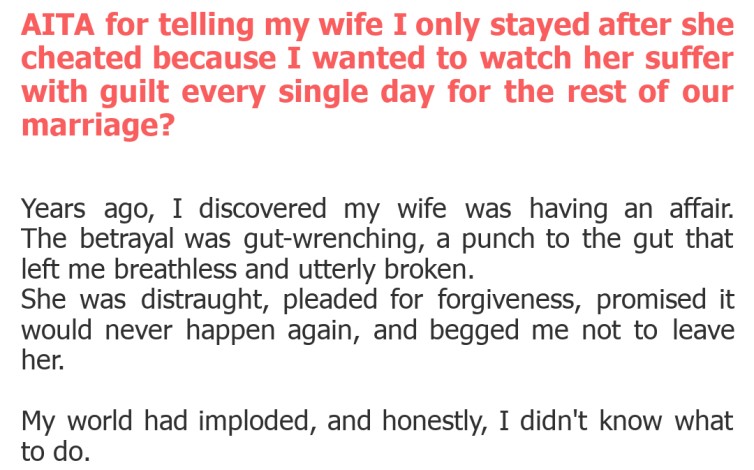 "AITA for telling my wife I only stayed after she cheated because I wanted to watch her suffer with guilt every single day for the rest of our marriage?"