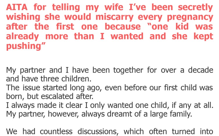 "AITA for telling my wife I’ve been secretly wishing she would miscarry every pregnancy after the first one because “one kid was already more than I wanted and she kept pushing”"