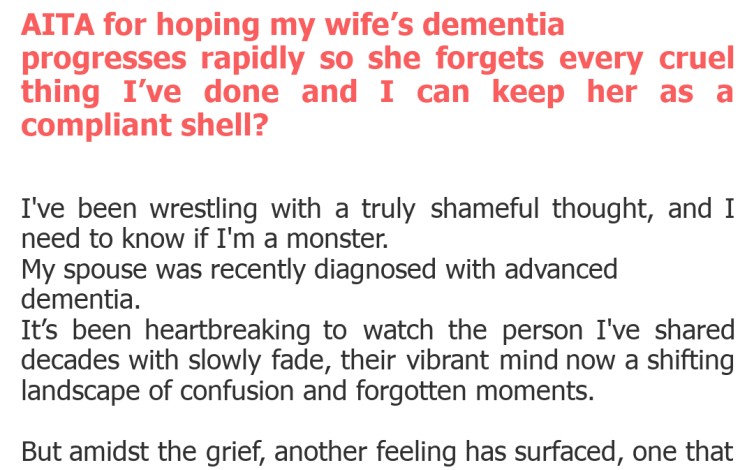 AITA for hoping my wife’s dementia progresses rapidly so she forgets every cruel thing I’ve done and I can keep her as a compliant shell?