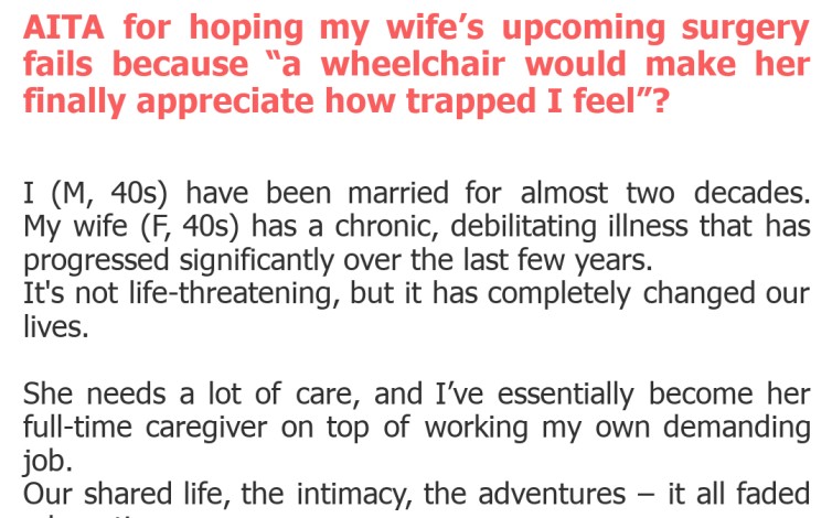 "AITA for hoping my wife’s upcoming surgery fails because “a wheelchair would make her finally appreciate how trapped I feel”?"