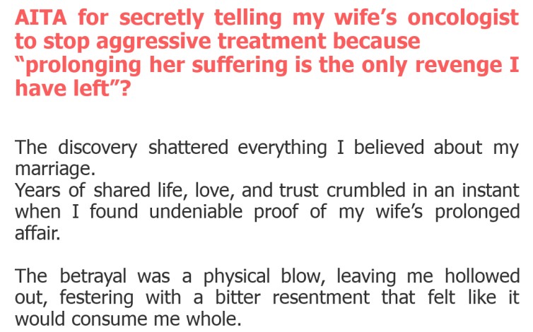 "AITA for secretly telling my wife’s oncologist to stop aggressive treatment because “prolonging her suffering is the only revenge I have left”?"
