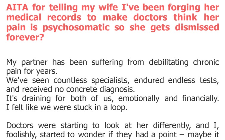 "AITA for telling my wife I've been forging her medical records to make doctors think her pain is psychosomatic so she gets dismissed forever?"