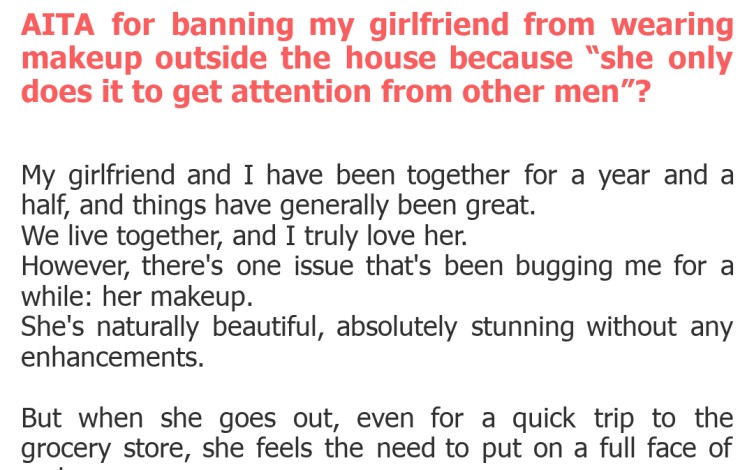"AITA for banning my girlfriend from wearing makeup outside the house because “she only does it to get attention from other men”?"