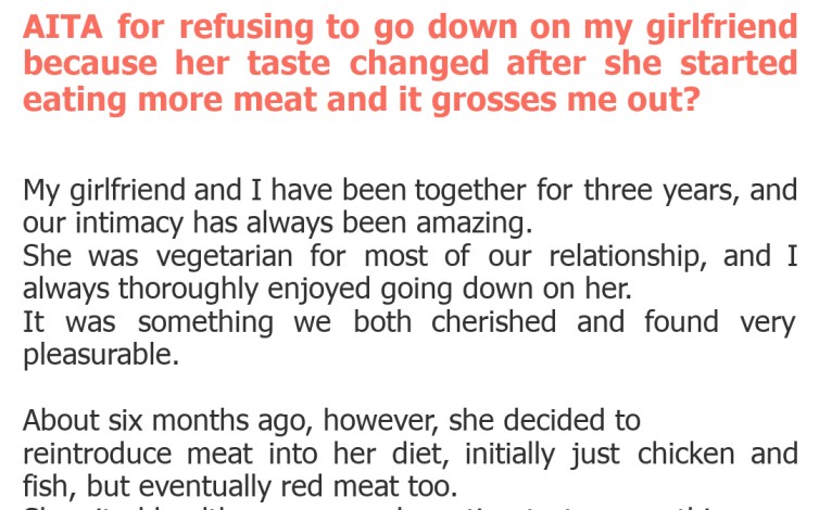 "AITA for refusing to go down on my girlfriend because her taste changed after she started eating more meat and it grosses me out?"