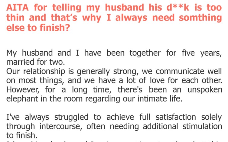 "AITA for telling my husband his d**k is too thin and that’s why I always need somthing else to finish?"