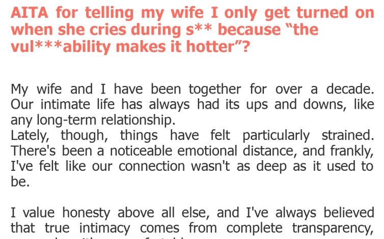 "AITA for telling my wife I only get turned on when she cries during s** because “the vul***ability makes it hotter”?"