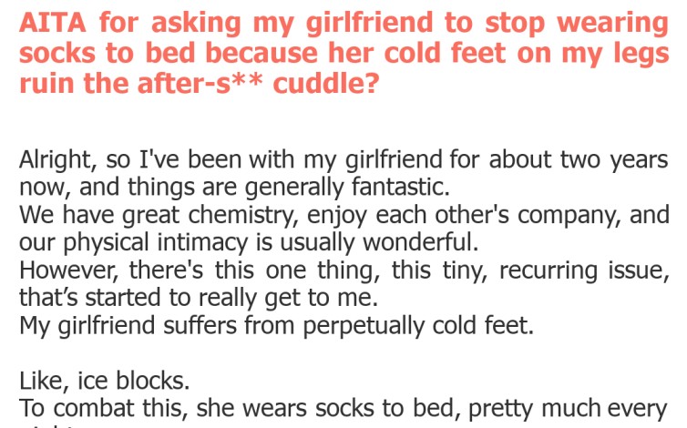 "AITA for asking my girlfriend to stop wearing socks to bed because her cold feet on my legs ruin the after-s** cuddle?"